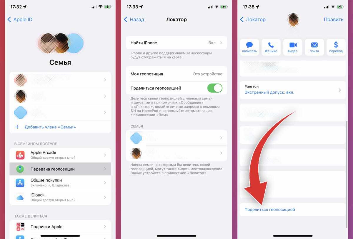 ▣ В карточке каждого из контактов семейного доступа активируйте пункт Поделиться геопозицией или Не делиться геопозицией.