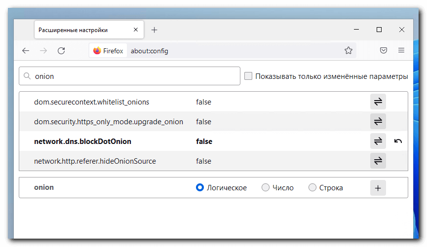 - Найдите network.dns.blockDotOnion (смотри картинку);