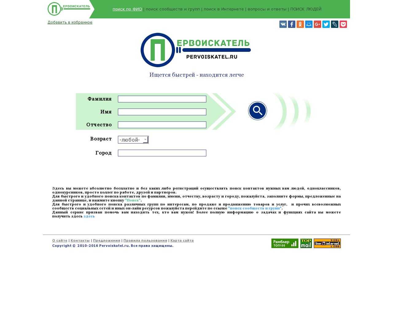 Ресурс «Первоискатель» также позволяет отыскать нужного человека. Здесь устанавливаются фильтры (город, возраст). Поисковый сервис проводит разделение на социальные сети. «Первоискатель» ищет заданного абонента через электронные ящики, школу, в кроссплатформенном мессенджере ICQ, но не охватывает Фейсбук и LiveJournal.