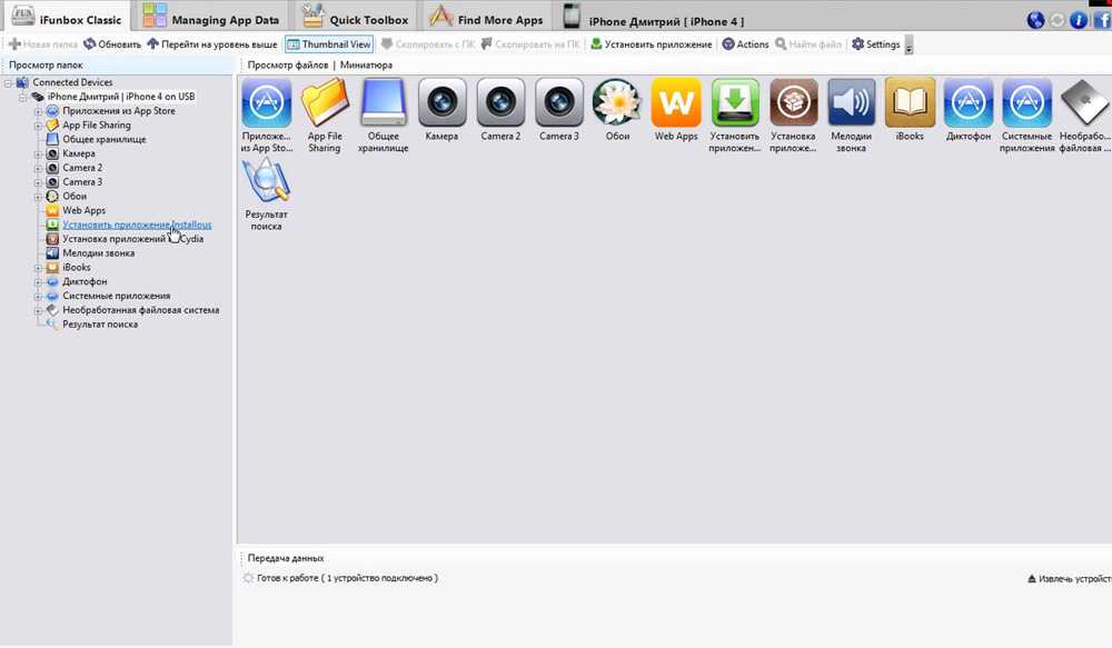 - Затем подключаем гаджет к рабочей станции, запускаем iFunBox и выбираем следующую последовательность: «Управление данными» — «Установка»;