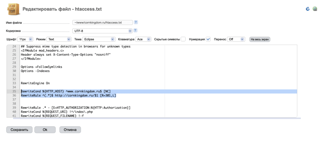 2. В редакторе файлов удалите нужные строки отвечающие за редирект и сохраните результат (Сохранить или Ок), см. рис. 4.
