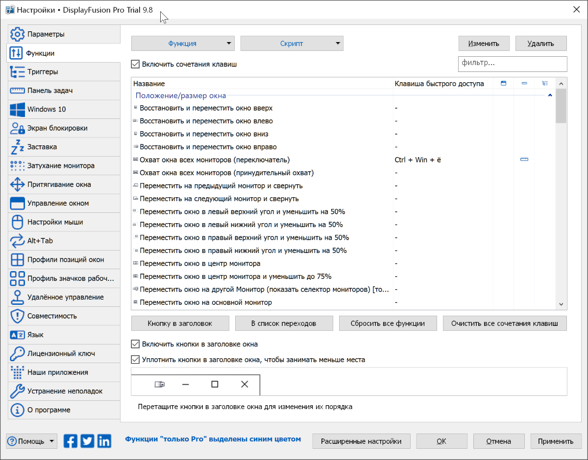 Еще одна полезная функция, которая возглавляет список, — это функции. Функции в основном позволяют настроить сочетание клавиш для большинства действий. В программе предустановлено множество функций, но вы всегда можете создать свои собственные функции или отредактировать существующие. И для всех функций вы можете включить кнопки TitleBar.