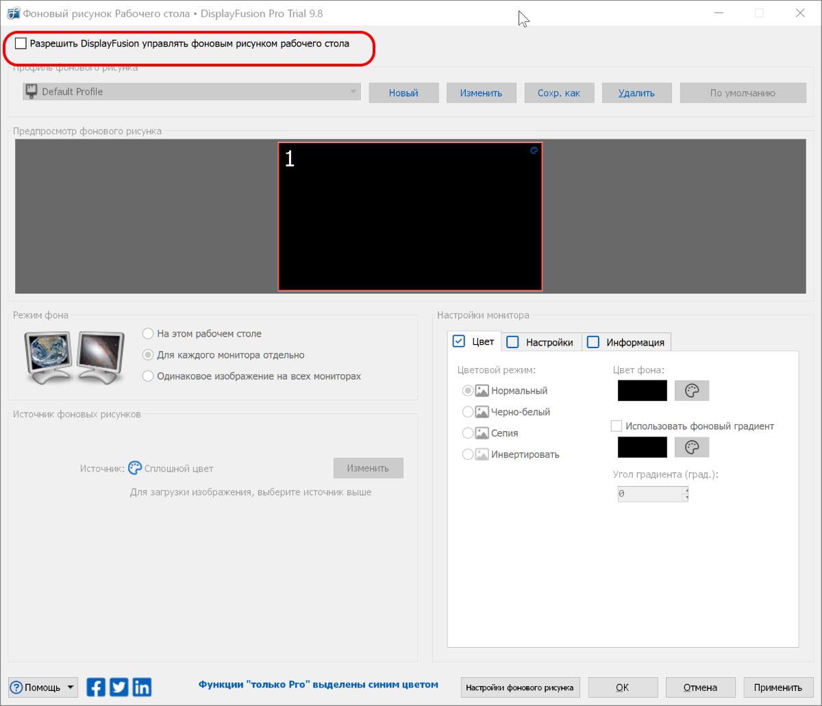 - Отметьте галочкой параметр Разрешить DisplayFusion управлять фоновым рисунком рабочего стола.