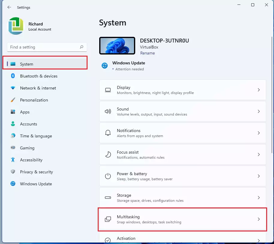 Панель настроек Windows должна выглядеть примерно так, как показано на рисунке ниже. В настройках Windows нажмите Система, затем на правой панели выберите Многозадачность поле, чтобы расширить его.