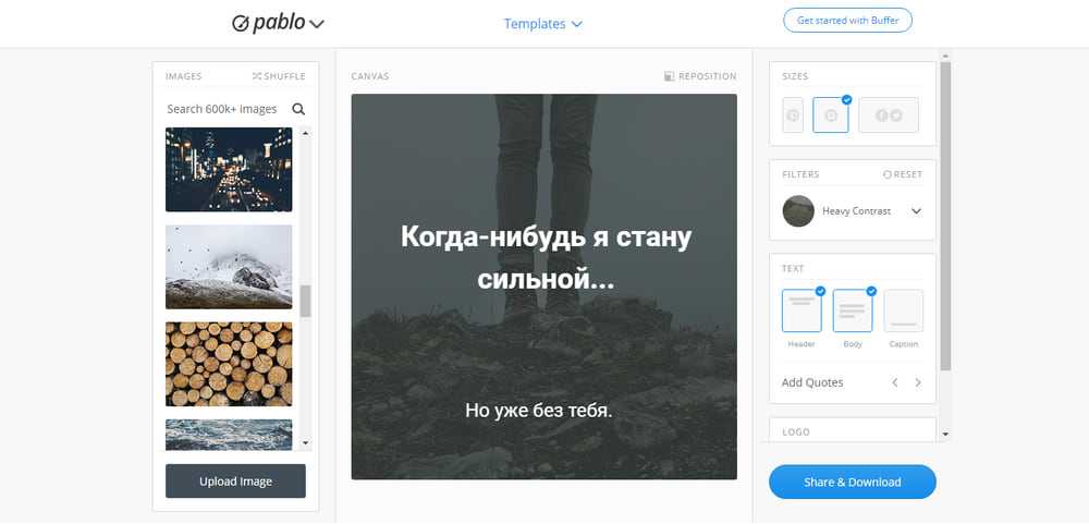 Простенький редактор изображений, в котором за пару минут можно сделать ванильную (или не очень) цитатку для соцсетей. Доступно более 600 тысяч изображений для фона, несколько готовых шаблонов и фильтров. Для разных соцтетей предусмотрены разные форматы. Картинки для фона также можно брать с других сайтов (если не запрещено): для этого нужно щелкнуть по изображению правой кнопкой мыши и выбрать «Open Image with Pablo». Единственный существенный минус – «красивых» кириллических шрифтов нет. Они доступны только для латинского алфавита.