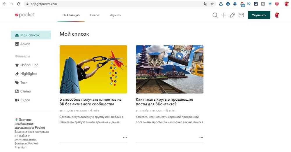 Вот так выглядит список статей в аккаунте сервиса Pocket