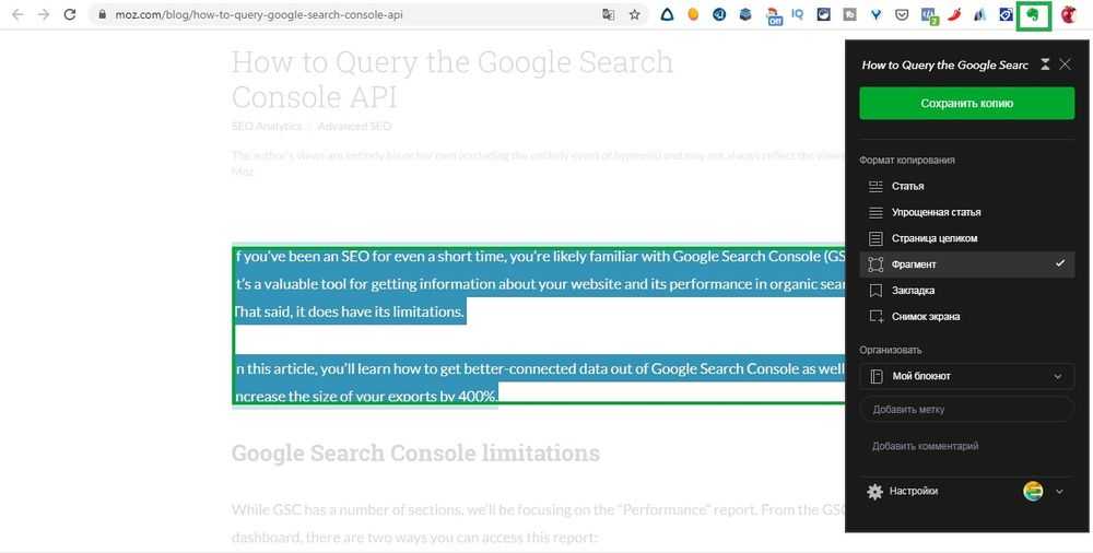 Если Pocket сохраняет страницу целиком, то Evernote Web Clipper позволяет отправить в Evernote (онлайн-сервис для создания заметок) только самую важную часть текста. Разумеется, для этого нужен аккаунт в Evernote.