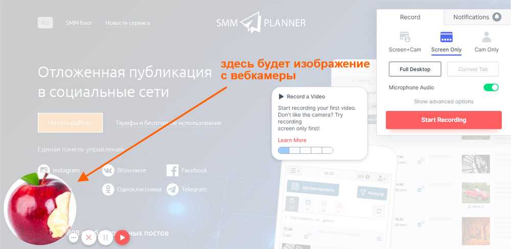 Удобный скринрекордер для браузера. Есть три режима записи: экран+вебкамера, только экран и только камера. Звук микрофона легко отключается при необходимости. После записи появится окно, где видео можно будет отредактировать и скачать (или скопировать ссылку на него).