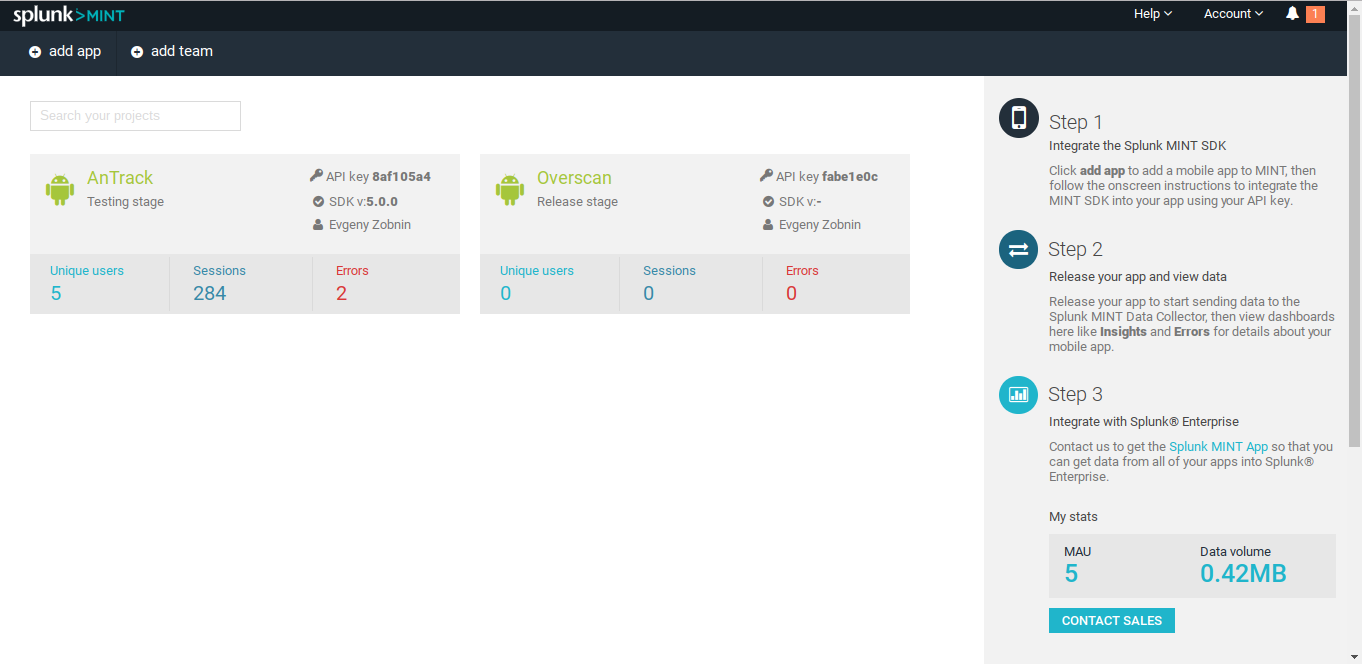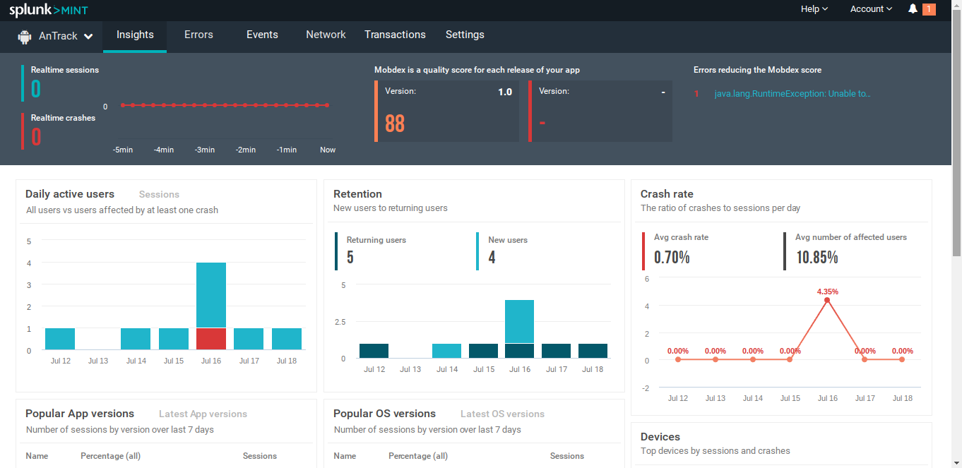 После сборки приложения и установки на устройство Splunk MINT начнет работать. Ты получишь доступ к статистике (количество установок, юзеров, падений, версии Android, использование сети и прочее):