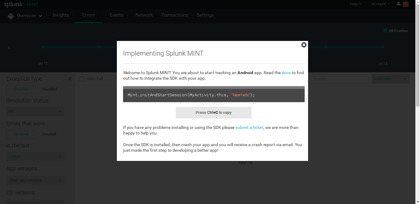 После этого Splunk MINT покажет тебе строку кода, которую необходимо вставить в код: