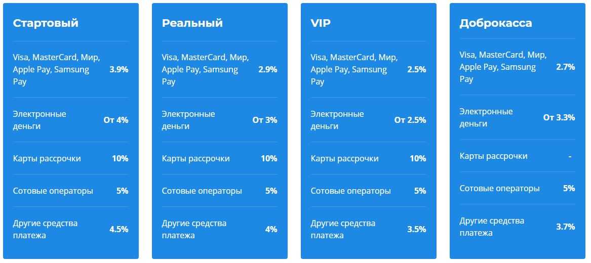 Сервис берёт комиссию только за успешно проведённые транзакции. В бизнес-аккаунте клиент платит от 3% за платежи по банковской карте и через электронный кошелёк. За платежи по СБП и через мобильного оператора комиссия составляет 4%.