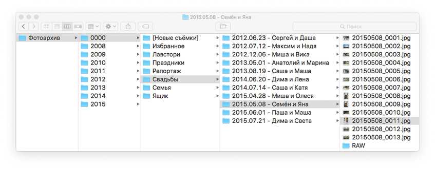 В папке «0000» съёмки делятся по направлениям. Структура зависит от услуг, на которых специализируется фотограф. К примеру, если это предметная съёмка, то добавляются категории: еда, одежда, украшения и т. д. В моём случае это свадьбы, лавстори, репортажи, праздники и семейные портреты .