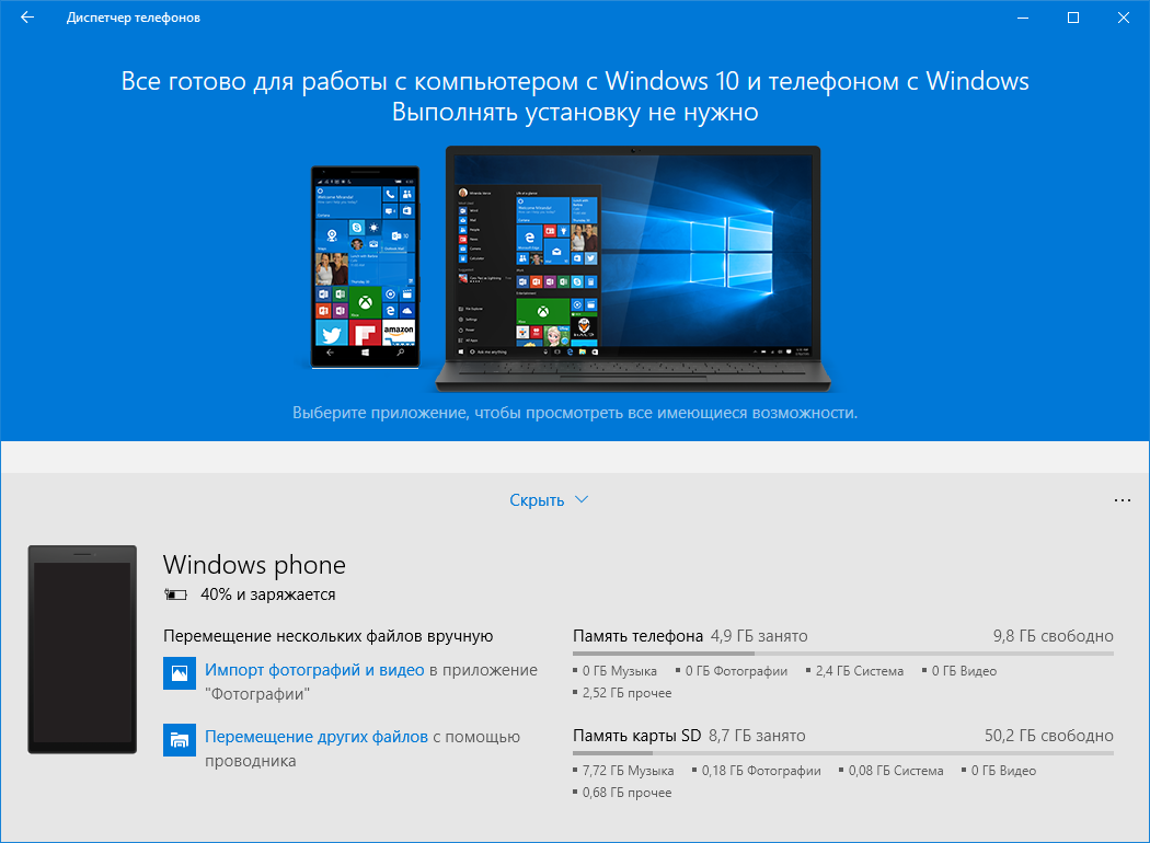 В Windows 10 есть утилита «Диспетчер телефонов». С ее помощью можно посмотреть состояние устройства: степень зарядки аккумулятора, сколько места занимают определенные коллекции данных (фото, видео), импортировать фото/видео и так далее.