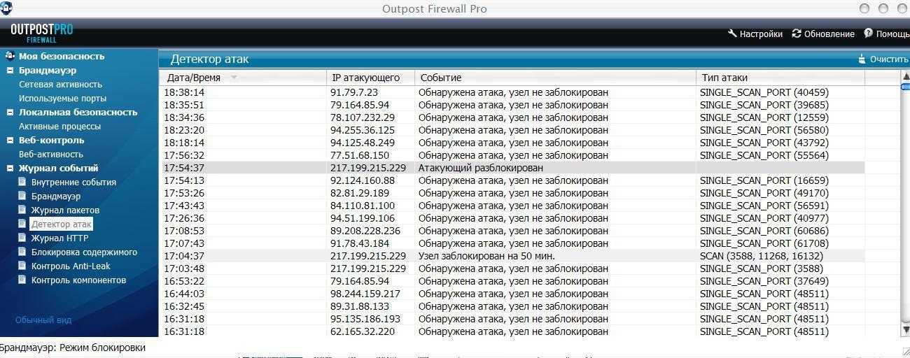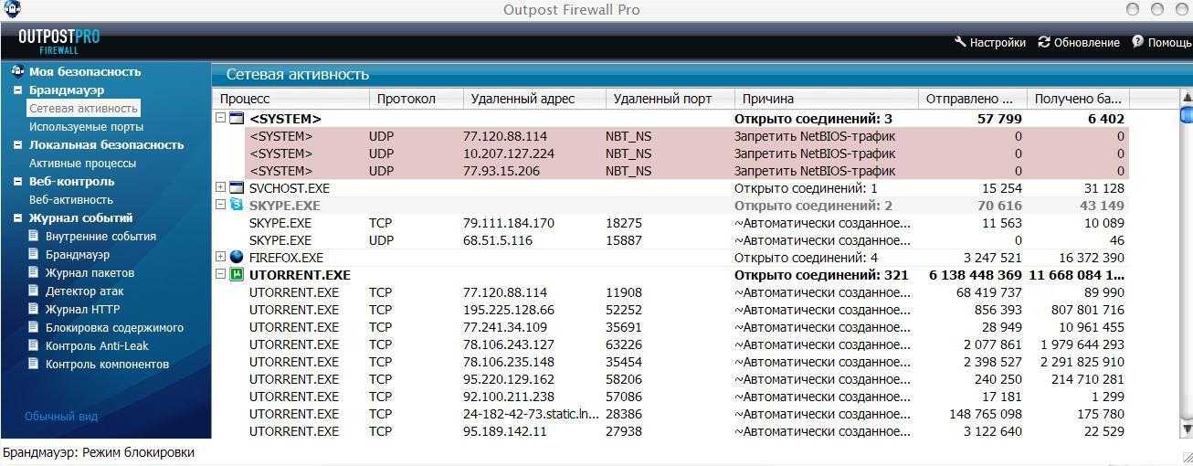 Дальше, будут приведены основные разделы: »брандмауэр» — контроль за процессами на вашем ПК, »сетевая активность» — открытые порты, а в разделе »активные процессы» — открытые приложения и контроль над ними. После этого остается лишь пользоваться компьютером в обычном темпе, ведь он будет надежно защищен Outpost Security Suite pro современным антивирусным комплексом.