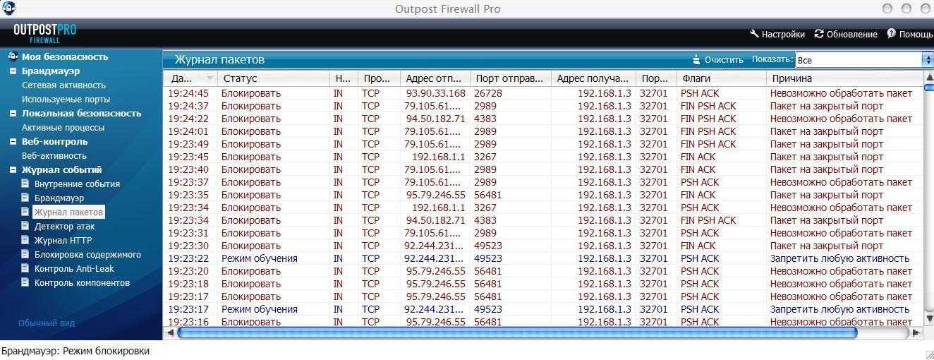- 5 политик работы Outpost: от полного разрешения сетевой активности до полной блокировки (Разрешать все/Режим разрешения/Режим обучения/Режим блокировки/Блокировать все)