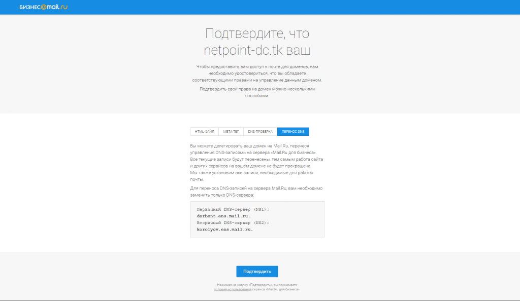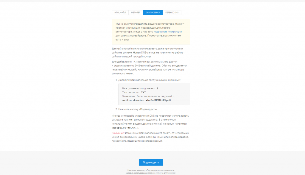 После того, как вы убедились в том, что запись TXT доступна, можно нажать на кнопку подтверждения: