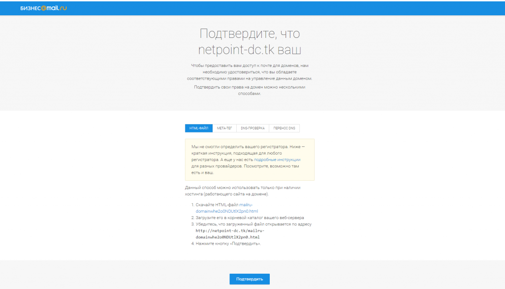 Выберите способ для подтверждения владения доменным именем.