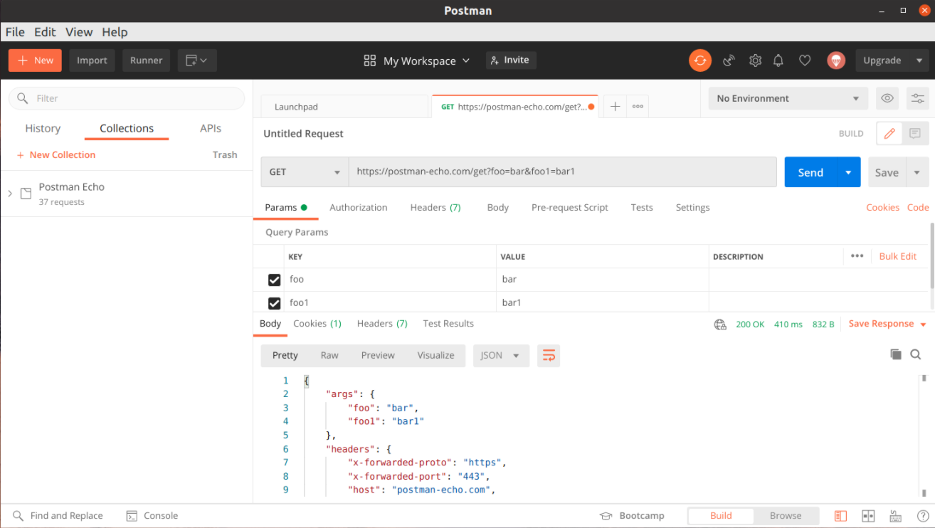 В программу встроен собственный сервис API, который и используется для тестирования внешних ресурсов. Чтобы обратиться к нему, следует кликнуть на «плюсик», выбрать из выпадающего списка тип запроса GET, а вместо домена вставить ссылку на сервис https://postman-echo.com/get.