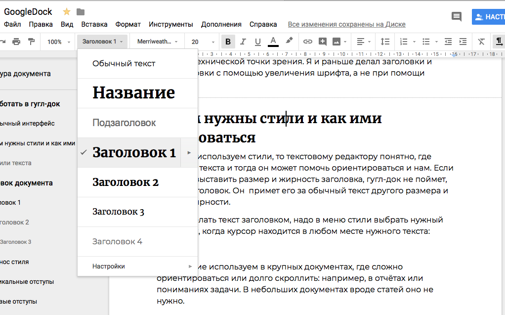 Когда мы используем стили, то текстовому редактору понятно, где какой тип текста, и тогда он может помочь ориентироваться и нам. Если вручную выставить размер и жирность заголовка, Google Docs не поймет, что это заголовок. Он примет его за обычный текст другого размера и другой жирности.