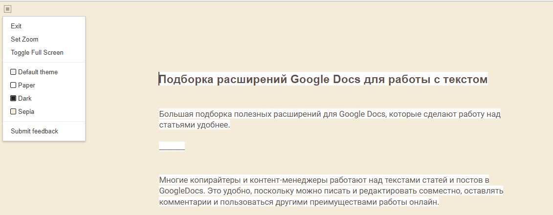 Расширение позволяет изменять режим просмотра текста. Включает полноформатный просмотр текста на весь экран, чтобы меню и вкладки не отвлекали, позволяет изменять цвета текста и фона, масштаб текста. Сам документ при этом не изменяется, все настройки касаются режима просмотра, в котором можно работать с текстом.