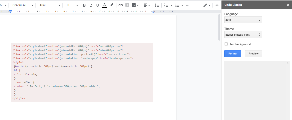 Расширение для оформления кода. Вставьте строчки кода в документ, выделите нужные и запустите расширение. Язык можно указать или предоставить расширению распознать его автоматически, и выбрать стиль оформления, чтобы оно подсветило синтаксис.