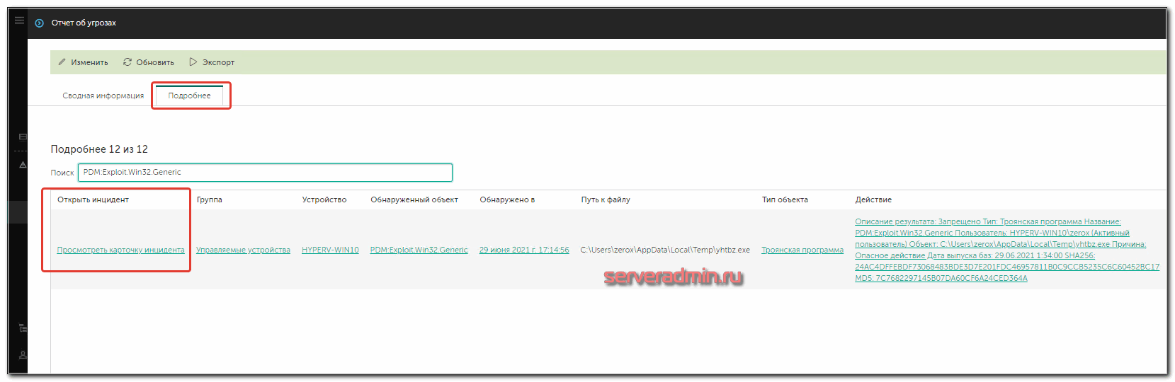 Идём в раздел Мониторинг и отчёты -> Отчёты, открываем Отчёт об угрозах. Переходим на вкладку Подробнее.