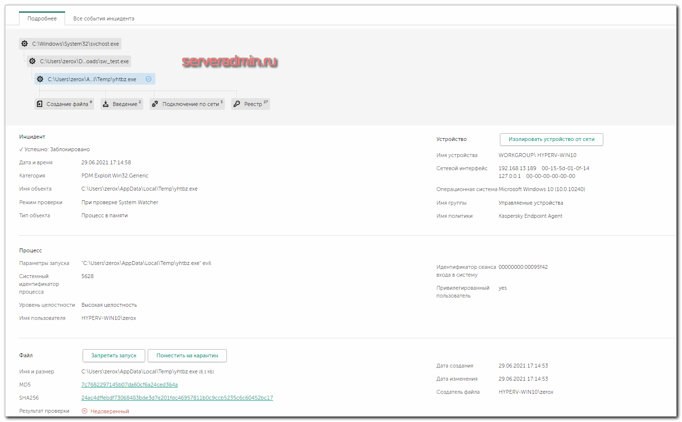 Давайте посмотрим, как на практике реализуется защита с помощью установленных ранее компонентов. Для теста я запустил на защищенной рабочей станции образец вируса. Локальный антивирус заблокировал его работу. Перемещаемся в KSC и смотрим информацию об инциденте.