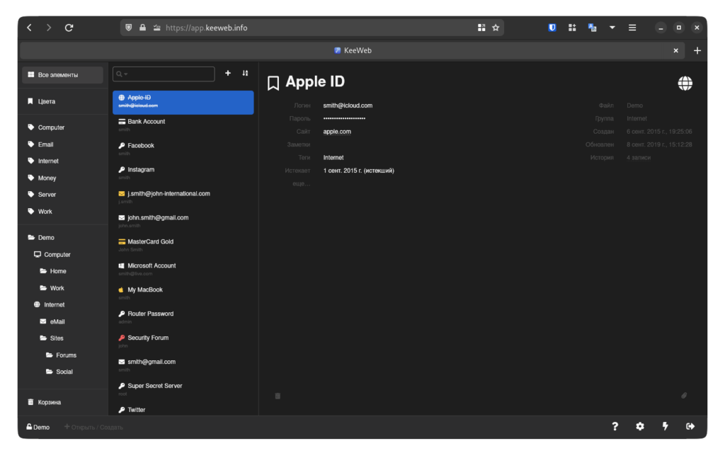 Главный экран KeeWeb будет привычен пользователям других похожих сервисов. Слева располагается нескрываемое меню, где можно выбрать, какие пароли и записи будут отображаться. Далее следует сам список записей с поиском, а большую часть окна занимает окно с отображением и редактированием данных.