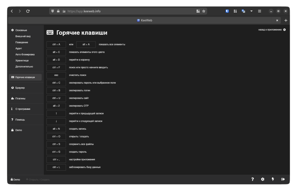 В настройках KeeWeb можно выбрать одну из 12 тем оформления, а также установить дополнительные из раздела плагинов.