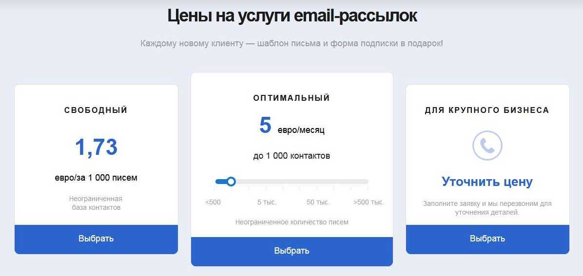 Ведение базы в 2,5-5 тыс. подписчиков обойдется в 2.000 руб./мес. без ограничения на отправку писем.