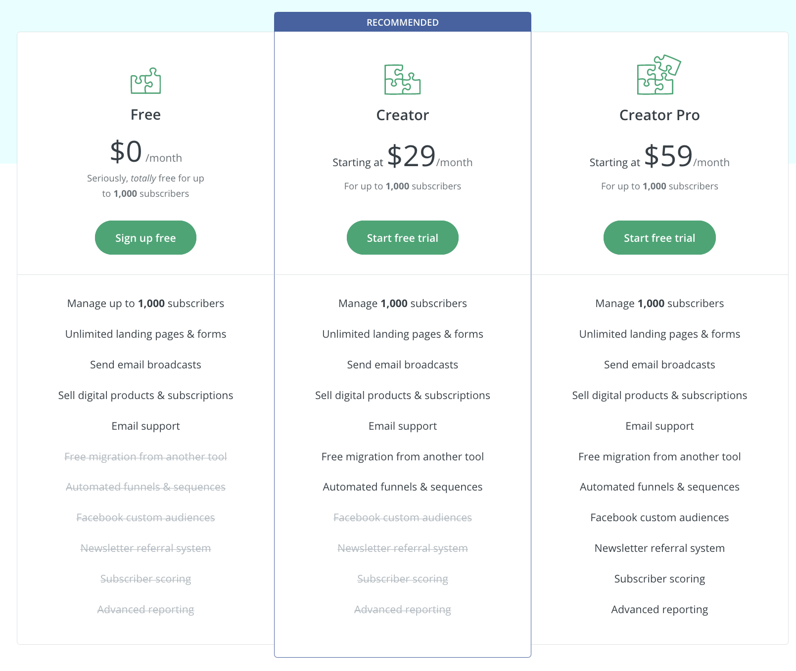 Базовый платный тариф Creator с 1000 подписчиков в месяц стоит 29$ в месяц, что несколько дороже, чем у GetResponse. Среди заявленных функций, в дополнение к бесплатному тарифу, – автоматизация, интеграции.