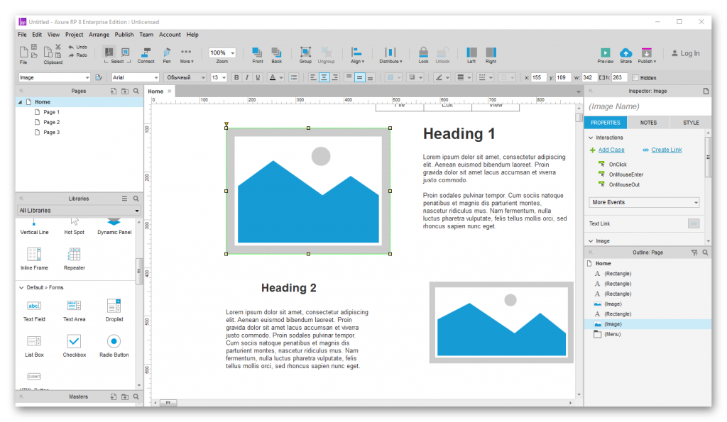 Самый известный сервис для прототипирования. В Axure можно делать прототипы и блок-схемы, прокладывать маршрут пользователей по сайту и прорабатывать разные варианты одной и той же страницы. И даже создавать интерактивный многостраничный эскиз для целого сайта (с работающими внутренними ссылками на другие страницы).