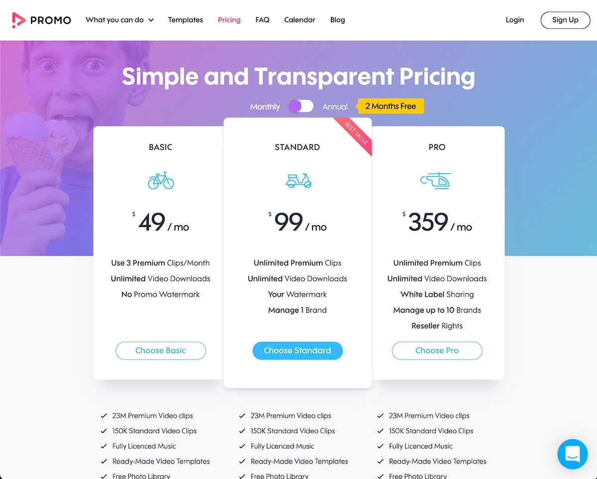 Promo comes with a free plan that you can use for as long as you like. Take the video maker for a test drive and get a feel of the features. You can’t download a video on the free plan, though.