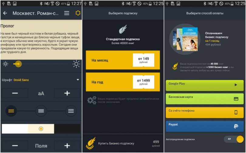Относительно молодой российский сервис, предоставляющий доступ к собственной онлайн-библиотеке по подписке. Необходима регистрация, после которой становится доступен каталог из более чем 63 000 книг, 8000 из которых бесплатные – в основном это классические произведения. Сам же каталог содержит самые разнообразные книги, разделённые по жанрам. Да, до Bookmate этому сервису, по количеству книг, ещё далеко, но пользоваться им комфортно можно уже сейчас – есть и синхронизация между устройствами и вполне комфортная «читалка» с базовой настройкой фона и шрифта. К сожалению, нет возможности читать книги не из каталога.