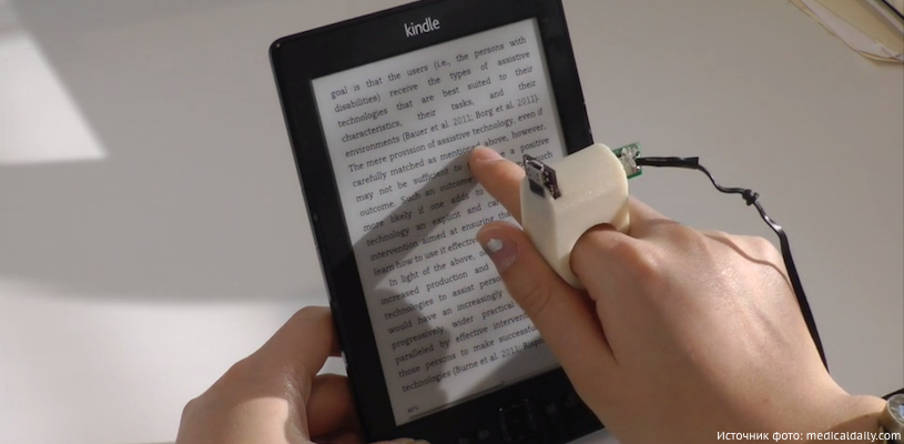 Необычный гаджет подсоединяется к компьютерам и смартфонам и носится на пальце, а сделан он был на 3D-принтере. Нужно проводить пальцем по телу текста, строчка за строчкой, и тогда миниатюрная камера просканирует данные и мгновенно озвучит всё, что обнаружит. С помощью вибраций Finger Reader может уведомлять слабовидящих читателей, что они находятся в начале строки или должны перейти на следующую строчку.