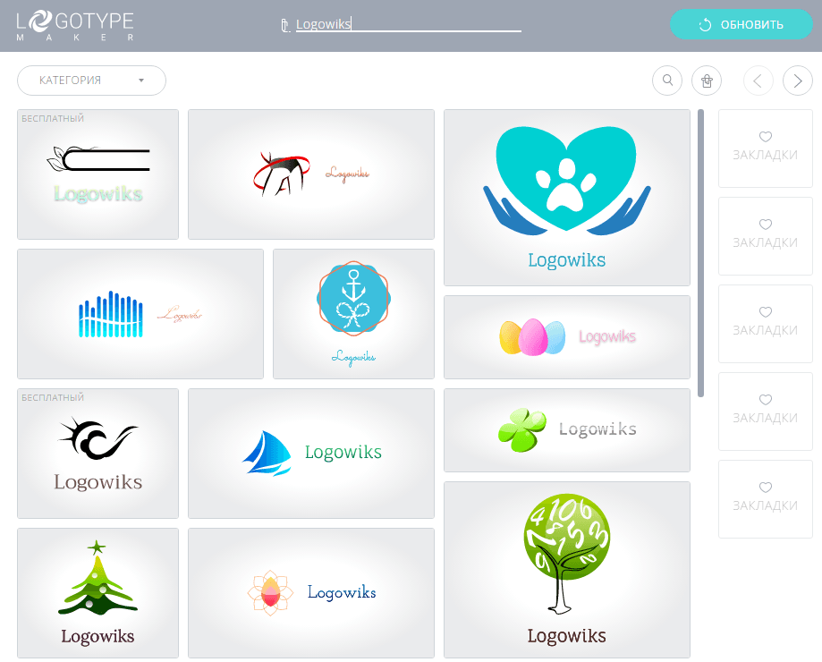 - Закладки – все понравившиеся в процессе поиска логотипы можно «лайкать», и вернуться к ним уже после того, как вы определились с выбором наиболее подходящих