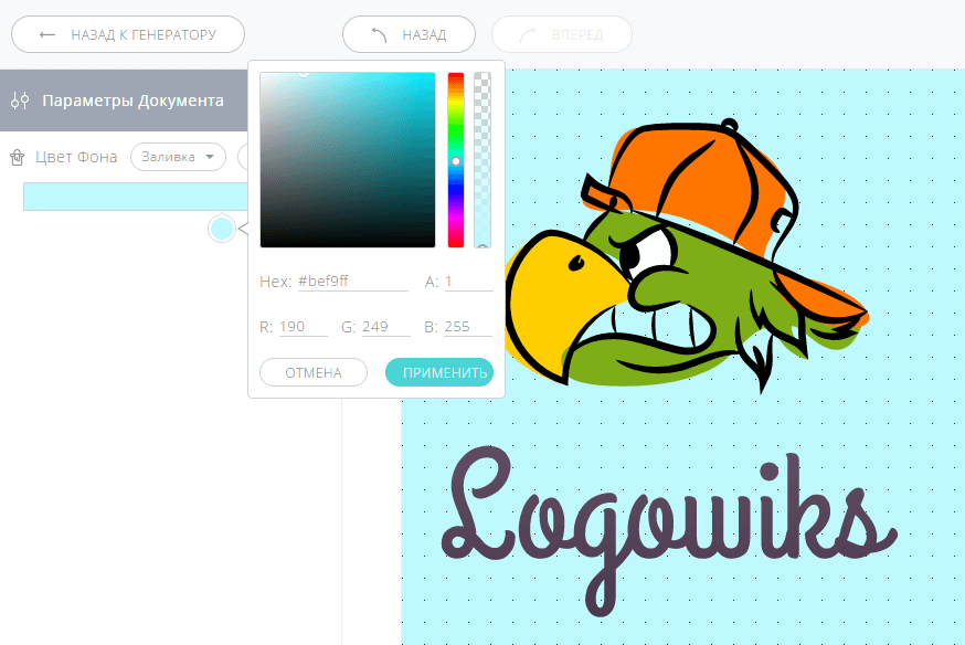 - Цвета – позволяет задать цвете заднего фона. К сожалению, цветовую схему задать нельзя, здесь вы можете только проверить, как будет выглядеть ваш логотип на определенном цвете
