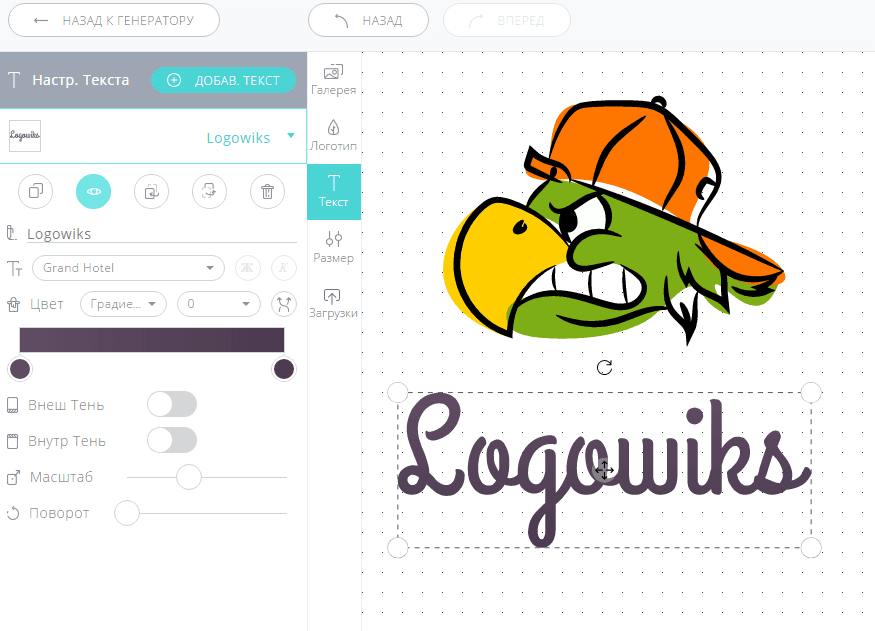 В режиме редактирования сервис сразу же подсказывает, какие инструменты доступны. Можно следовать подсказкам или же изучить функциональность Logotypemaker’а самостоятельно.