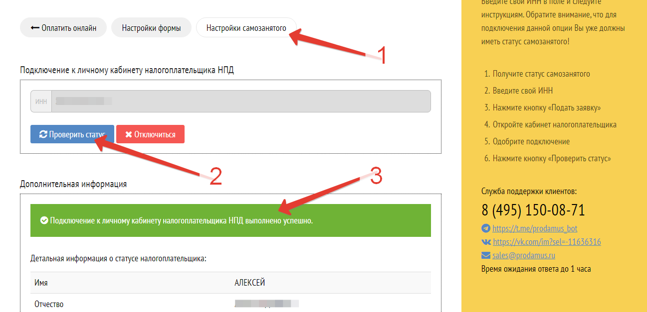 Далее нам нужно проверить сработало ли подключение – для этого мы возвращаемся назад на платежную страницу в раздел «Настройки самозанятых» и нажимаем кнопку «Проверить статус».