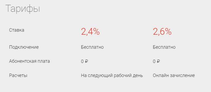 — при увеличении оборота: от 500 000 р./мес — комиссия за эквайринг составит 3.2%; от 700 000 р./мес — 3.0%; 1 000 000 р./мес — 2.9%