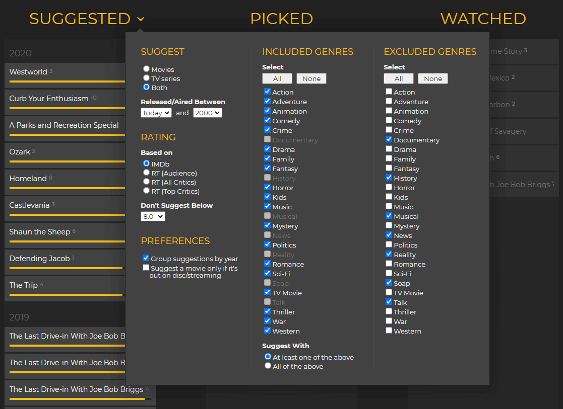 Вы можете выбрать минимальный рейтинг на IMDb или Rotten Tomatoes. Но самый большой фильтр — по жанрам. Есть возможность исключить определенные жанры.