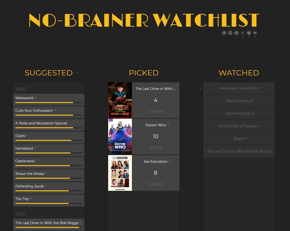 После того, как No-Brainer Watchlist представит вам список рекомендаций, перетащите любой интересный вариант в другие столбцы. Если вы наведете курсор на любой заголовок, вы увидите его синопсис и рейтинги. Рядом с названием каждого сериала с помощью небольшой цифры указывается сколько сезонов уже было выпущено.