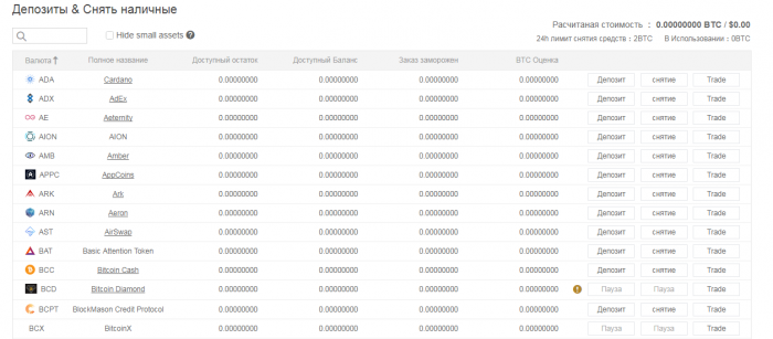 - Криптовалюты: BTC, HBTC, ETH, USDT, TUSD, USDC, HT, XMR, LTC, DASH, TRX, ADA, EOS, ZEC, XLM, XRP.