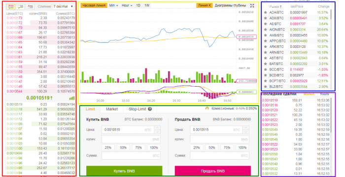 Синий блок — доступные для составления ордера монеты. Нужный коин будет сочетаться с одной из основных монет — BTC, ETH, BNB, USDT.