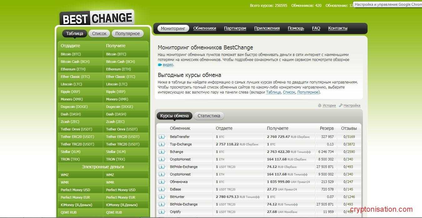 Именно для удобства работы с обменниками криптовалют был создан онлайн-сервис BestChange, который мониторит электронные обменные пункты в рунете и предлагает лучшие варианты для сделки.