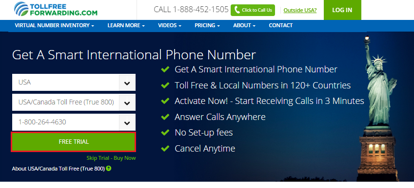 На следующей странице в окошке «Get a virtual number in» еще раз выберите страну и регион, где вы хотите получить виртуальный номер, и щелкните кнопку «Instant Free Trial»