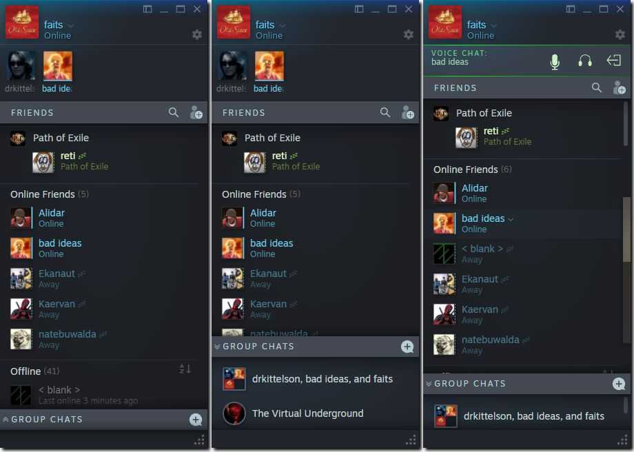 Ваш список друзей — это сердце Steam Chat. Здесь вы можете увидеть, кто в сети, и получить доступ ко всем вашим индивидуальным и групповым чатам. Вы можете нажать на имя любого друга, чтобы отправить ему сообщение, или просмотреть последние две недели истории чата с ним, или нажать на групповой чат, чтобы открыть его.