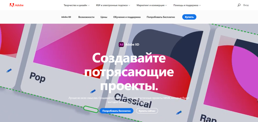 Adobe XD – настоящий конкурент Figma, который обладает практически тем же функционалом, но на платной основе. Это векторный инструмент, разработанный и опубликованный компанией Adobe Inc для разработки и создания прототипов пользовательского интерфейса для веб- и мобильных приложений. Создан для дизайнеров, творческих коллективов и организаций, которым необходимо творить в большом масштабе.