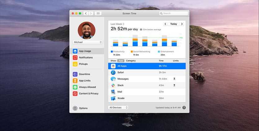 2. Экранное время теперь есть и на macOS. Система может объединять статистику с мобильными устройствами через iCloud и управлять общими лимитами на работу с приложениями.