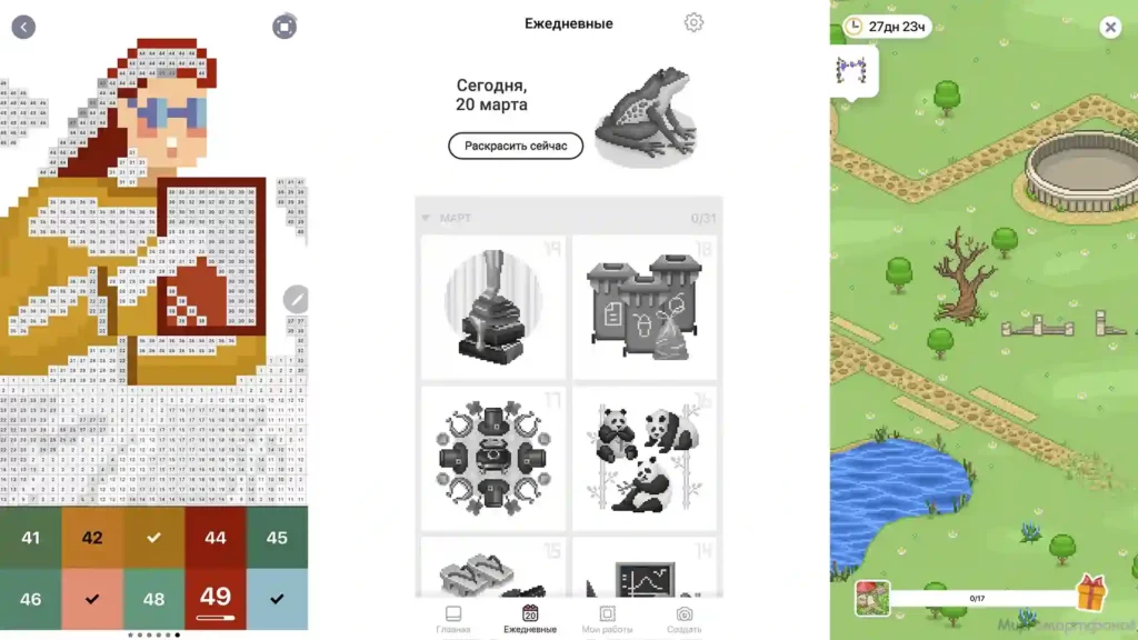 Продвинутая антистресс раскраска делает упор на пиксельную графику. Она предлагает огромный обновляемый каталог изображений в 2D и 3D для дальнейшей обработки. Чтобы процесс стал интереснее, пользователям доступны волшебная палочка и красящая клякса. Также возможно раскрашивание черно-белых фотографий.